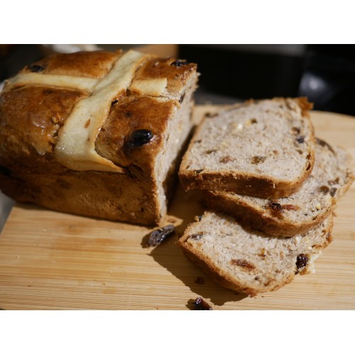 Very rich & tasty, this easily toastable tin loaf is made with our hot cross bun dough - with our own honey, saffron infused double cream, lots of spice & an apple juice glaze.