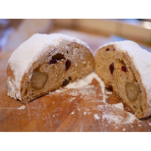 Our take on the classic German festive treat is made with a butter enriched dough, spiced with cardamom and nutmeg, with plenty of rum-soaked raisins, candied citrus peel, glacé cherries, cranberries and flaked almonds and a core of marzipan. They are 150g.
